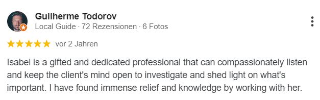 “Ich schätze die Arbeit von Isabel sehr. Sie ist auf meine Wünsche und Ziele eingegangen und hat mich toll begleitet und unterstützt, mich weiterzuentwickeln. Ohne ihre Arbeit wäre ich heute nicht da, wo ich heute bin. Die Ansätze The Work und NLP fand ich besonders hilfreich, aber auch die offenen Gespräche haben mir viel gebracht. Ich konnte Isabel ab der ersten Sitzung vertrauen und habe ihr viele Sachen erzählt, die ich vorher noch niemandem erzählt hatte. Also, von tiefstem Herzen: Danke Isabel!!”