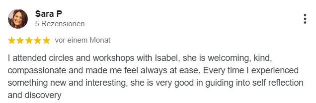 “Isabel kenne ich seit ca. 3 Jahren. Durch Zufall erfuhr ich von ihrem Frauenkreis und war begeistert. Die Atmosphäre war immer eine ganz besondere und es gab Raum um sich spielerisch, kreativ und mit der Stimme zu öffnen. Dies hat mir immer wieder geholfen um mehr bei mir selbst zu sein, mich zu zeigen, mich zu entwickeln und Themen loszulassen. Ich bin ihr sehr dankbar für diese kraftvolle und inspirierende Begleitung. Inzwischen ist Isabel mit ihrer langjährigen Erfahrung und den verschiedenen Techniken mein Joker geworden, wenn ich merke, dass ich anderweitig Hilfe benötige. Ich bin immer wieder dankbar gewesen über den respektvollen und wertschätzenden Umgang, egal mit welchen Themen man kommt. Ihre große Stärke ist, sein Gegenüber wahrzunehmen wie es ist und es auch sein zu lassen. Den Menschen wirklich zuzuhören und da sein zu lassen. Dadurch entsteht bei mir ein großes Vertrauen, dass ich mich öffnen kann. Ich bin ihr sehr dankbar für 2 unglaubliche NLP-Sitzungen, für die ich so gar keine Worte finden kann. Sie hat die Liebe, das Vertrauen und die eine tiefe Verbindung zurückgeholt. Diesen Anker trage ich in mir und freue mich über die Entwicklungen in denen ich freier und ich selbst bin. DANKE!!!”